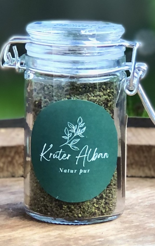 Brennnessel, Schafgarbe, Dost, Basilikum, Ittinger Minze, Wildkäuter-Blüten aus Albans Garten oder der Natur plus Meersalz. Schmeckt nicht nur gut, tut auch gut.